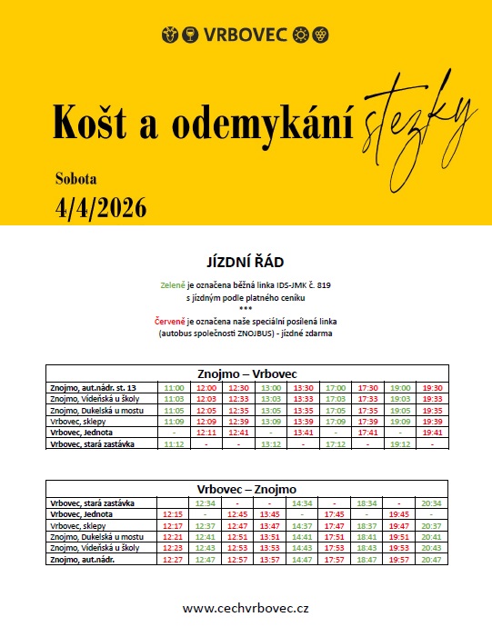 V den konání akce bude pendlovat autobus Znojmo-Vrbovec. Jízdní řád naleznete zde.